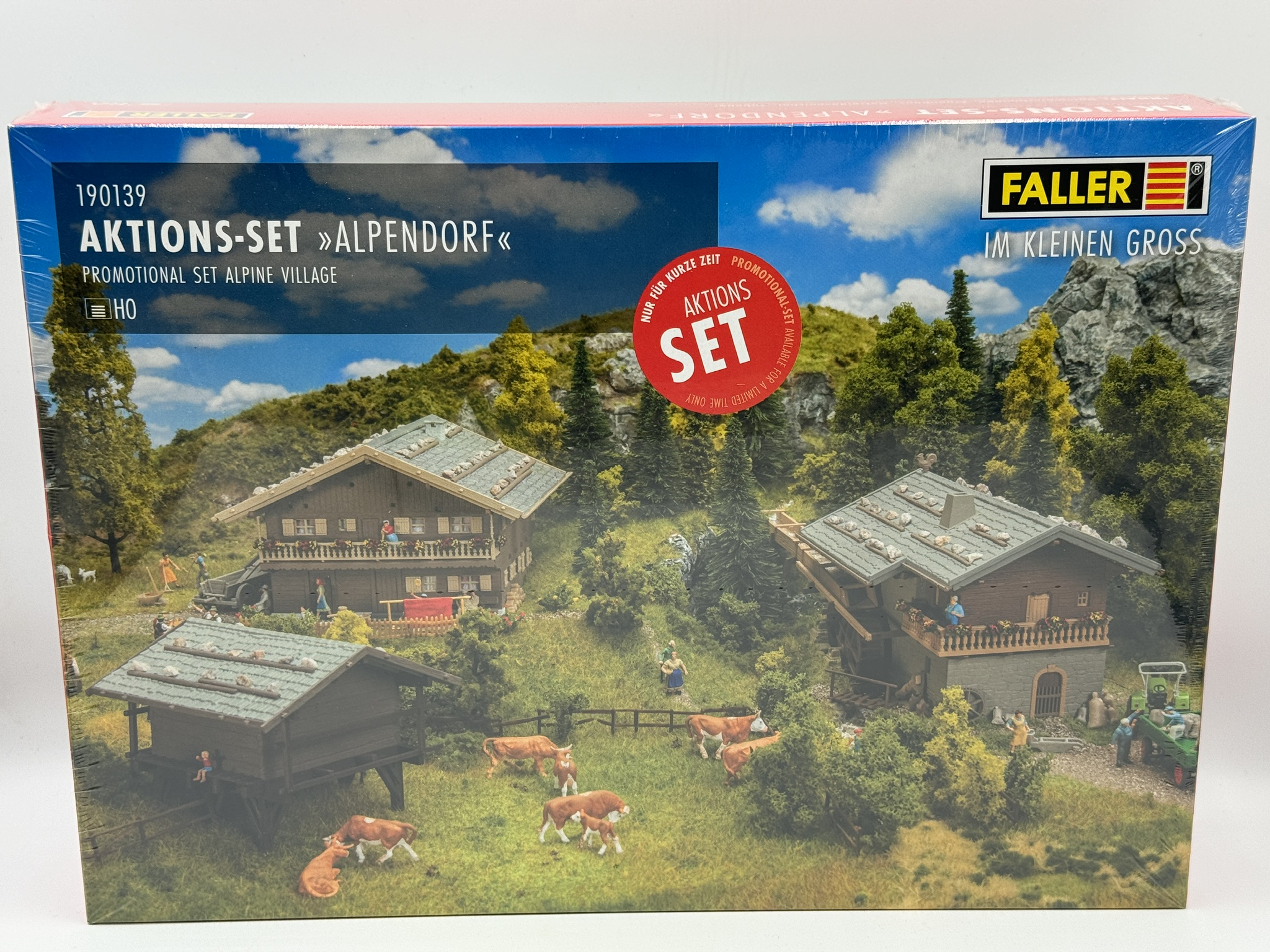 Das FALLER HO 190139 Aktions-Set Alpendorf versprüht Alpenflair mit einem mehrteiligen Gebäude-Set im alpenländischen Stil, bestehend aus einem klassischen Wohngebäude, einer gemauerten Hammerschmiede mit Wasserrad, einem kleinen Heuschober sowie passendem Zubehör wie Ackerwagen, Schubkarren, Leitern und mehr. Der Bausatz umfasst 355 Einzelteile in 13 Farben, Fensterfolie, 2 Gardinenmasken und 3 Bauanleitungen. Zur Montage wird die Verwendung von FALLER EXPERT Plastikkleber empfohlen.