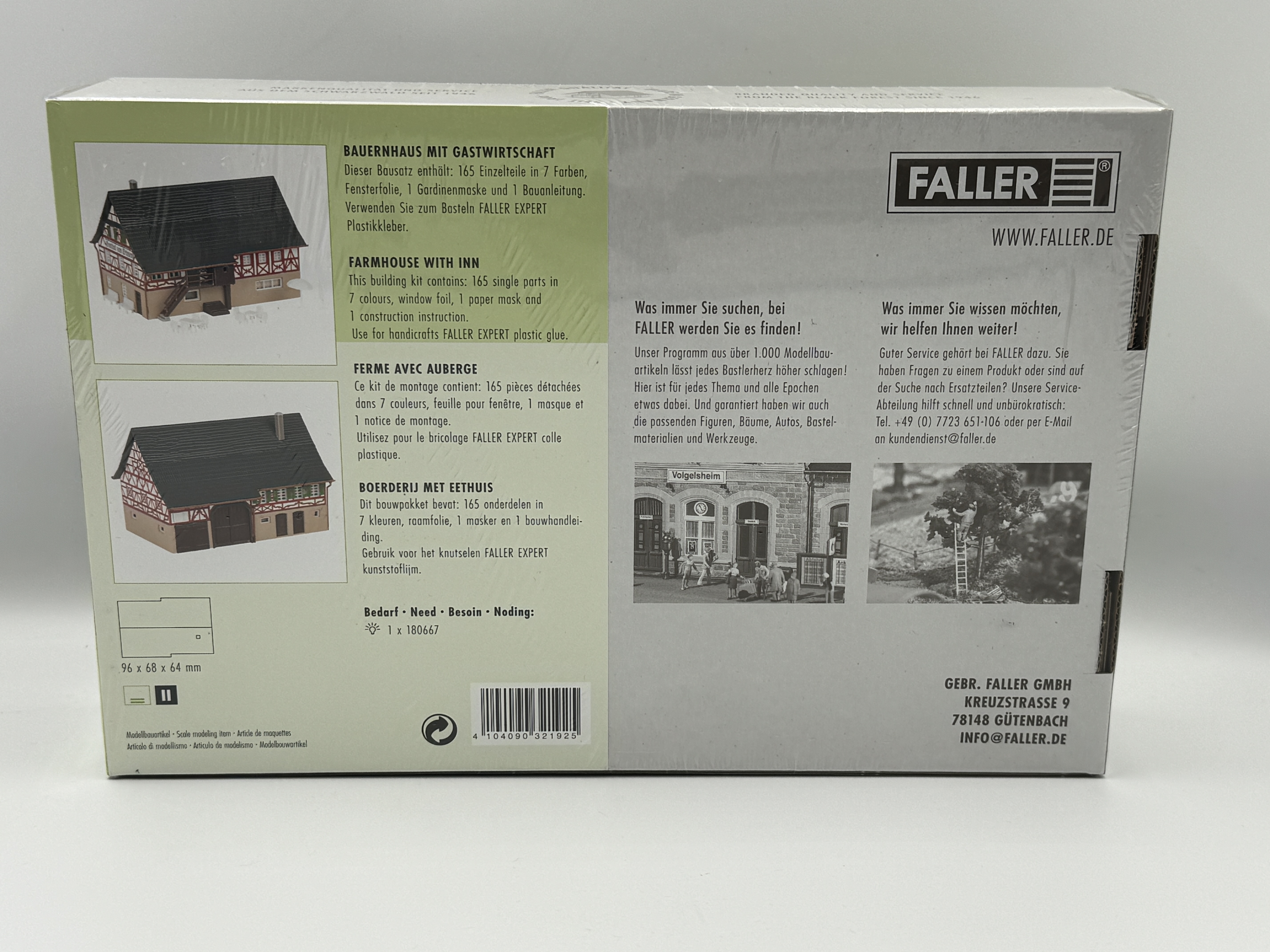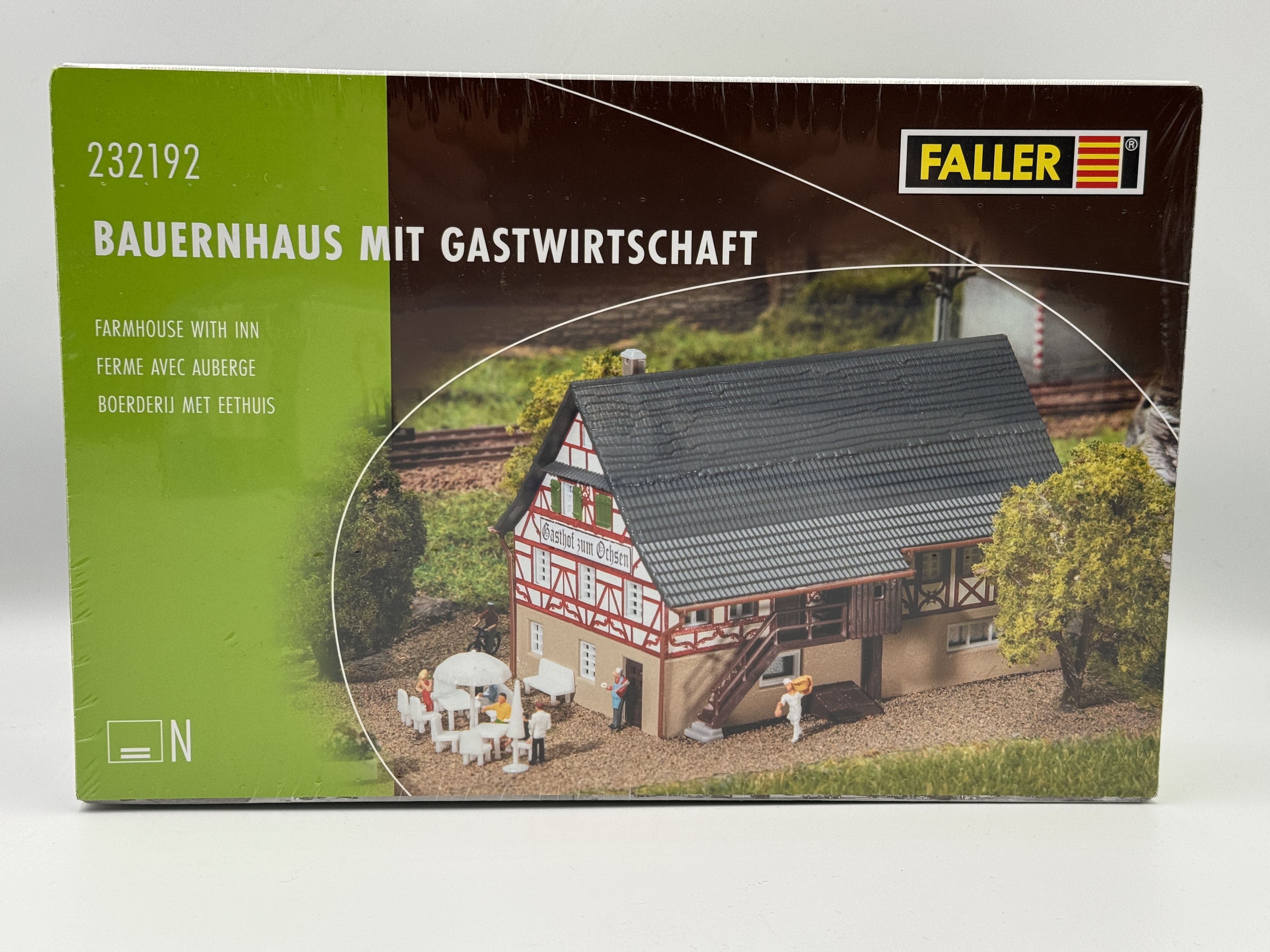 Der ländliche Gasthof von FALLER präsentiert sich in einem großzügigen, zweigeschossigen Einhaus mit digital aufgedrucktem Fachwerkobergeschoss, Außentreppe und unterschiedlicher Ziegeleindeckung. Der Bausatz umfasst 165 Einzelteile in 7 Farben, Fensterfolie, eine Gardinenmaske und eine detaillierte Bauanleitung. Für den Zusammenbau wird die Verwendung von FALLER EXPERT Plastikkleber empfohlen. Ideal für eine authentische Außengestaltung sind im Set Tische, Stühle und Sonnenschirme enthalten.