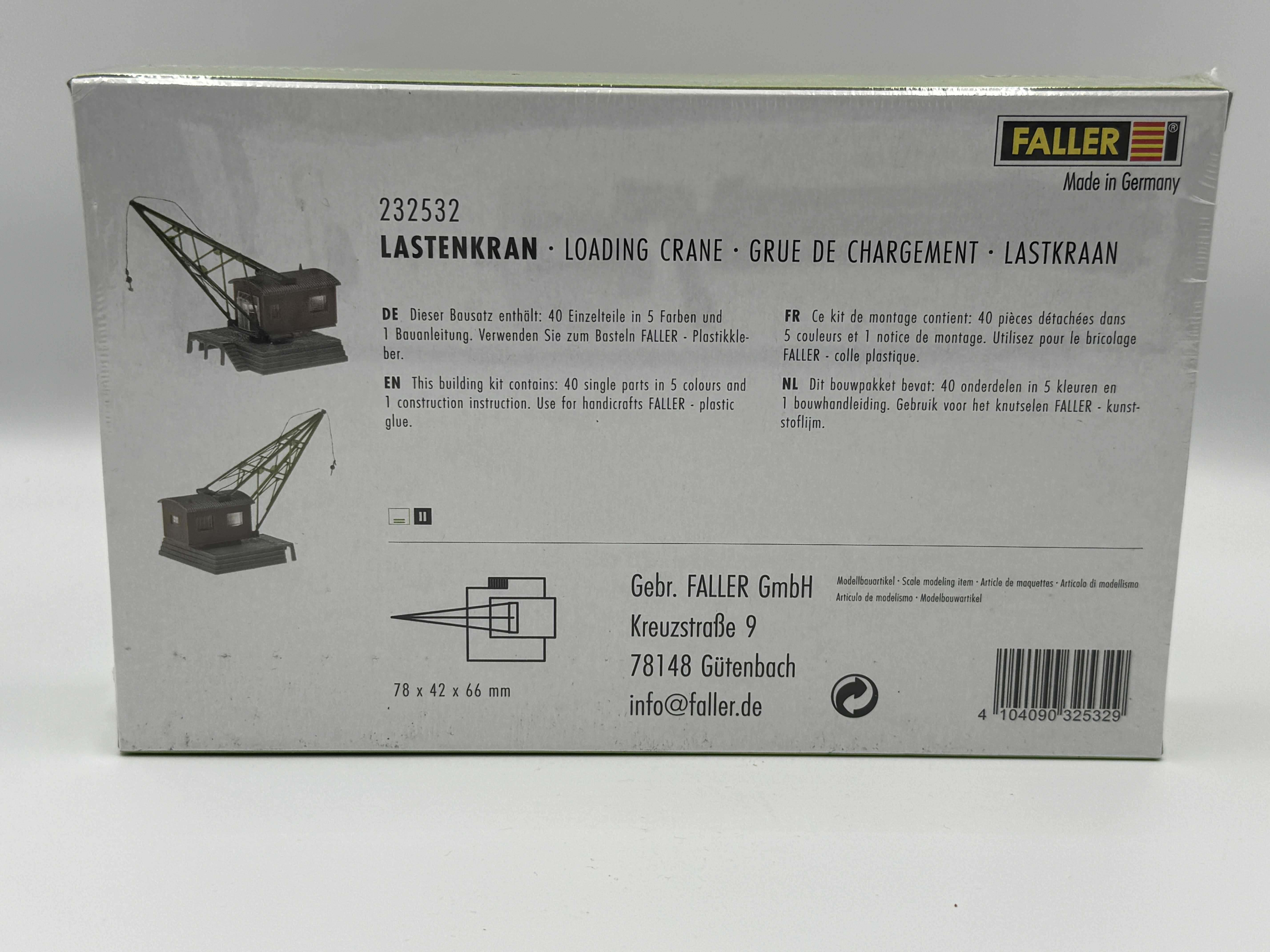 Der Lastenkran von FALLER erleichtert das Verladen von Gütern und Containern auf N-Anlagen. Der Bausatz überzeugt mit detaillierter Optik und vorbildgetreuer Darstellung. Mit 40 Einzelteilen in 5 Farben und einer Bauanleitung eignet er sich durch seinen niedrigen Schwierigkeitsgrad ideal für alle Bastel-Begeisterten.
