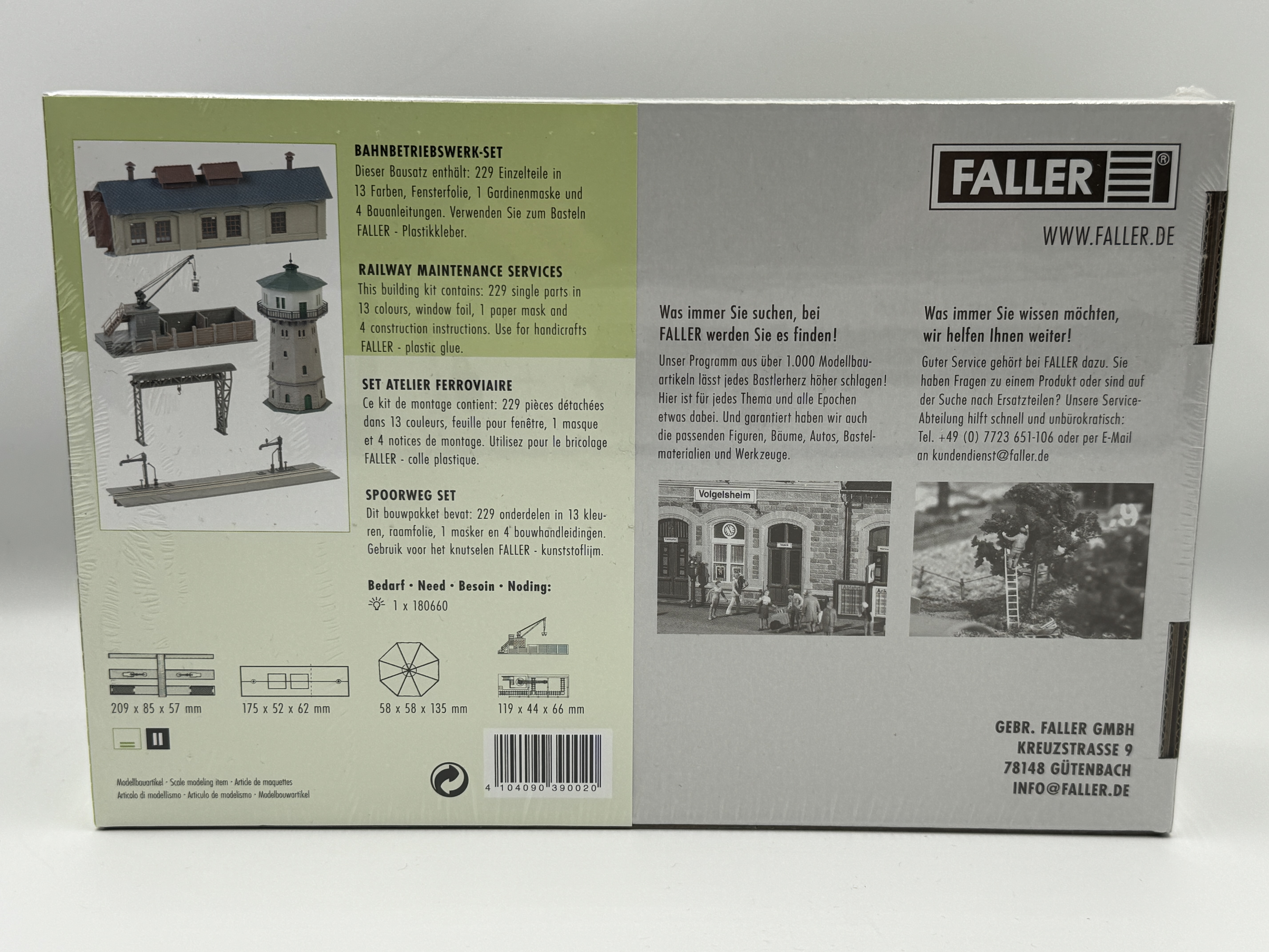 Das FALLER N 239002 Bahnbetriebswerk-Set präsentiert ein 4-teiliges Ensemble mit einem 1-ständigen Lokschuppen, einer Kleinbekohlungsanlage inklusive schwenkbarem Verladekran, einem Wasserturm sowie einer Untersuchungsgrube mit passendem Bockkran – perfekt für Kohle, Wasser, Sand und Schlacke. Der Bausatz umfasst 229 Einzelteile in 13 Farben, Fensterfolie, 1 Gardinenmaske und 4 Bauanleitungen. Zur Montage wird die Verwendung von FALLER – Plastikkleber empfohlen.